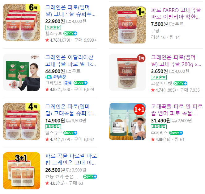 파로 곡물의 가격은 제품의 중량과 브랜드에 따라 다양하게 나타납니다. 파로 곡물의 가격은 구매처, 포장 단위, 원산지 (이탈리아산, 미국산 등)에 따라 차이가 있으므로, 구매 시 이러한 요소들을 고려하여 비교해보는 것이 좋습니다. 파로 곡물 가격비교 해보시고 좋은 파로 곡물 구매하시길 바랍니다.