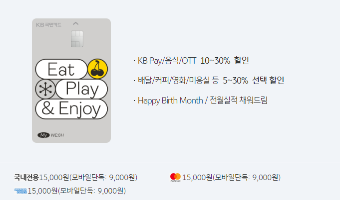 할인 기준: 전월 이용금액 30만 원 이상일 경우 월 최대 10,000원, 60만 원 이상일 경우 월 최대 20,000원의 할인을 받을 수 있습니다.