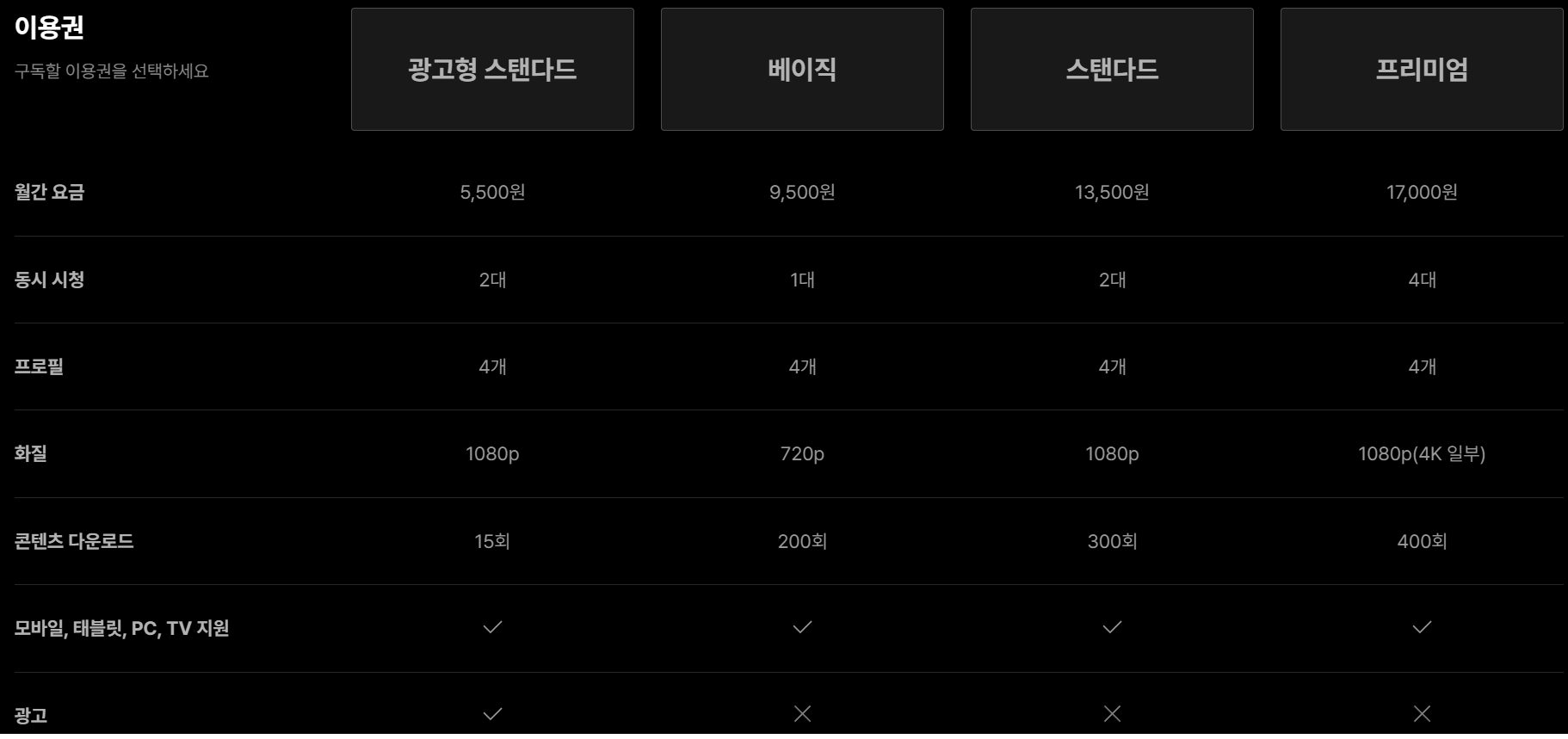 • 프리미엄은 가장 높은 요금제를 적용하며, 동시 시청 4대, 4K 화질(일부 콘텐츠) 지원, 400회의 콘텐츠 다운로드가 가능합니다.