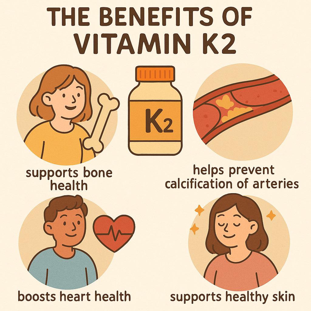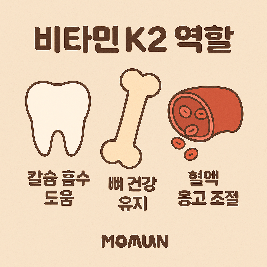 비타민K2는 칼슘이 뼈에 잘 흡수되도록 돕고, 칼슘이 뼈에 제대로 고정되도록 하는 역할을 합니다. 특히 골다공증 예방과 뼈 밀도 유지에 중요한 역할을 하며, 폐경 이후 여성과 노년층에게 매우 필수적인 영양소입니다.