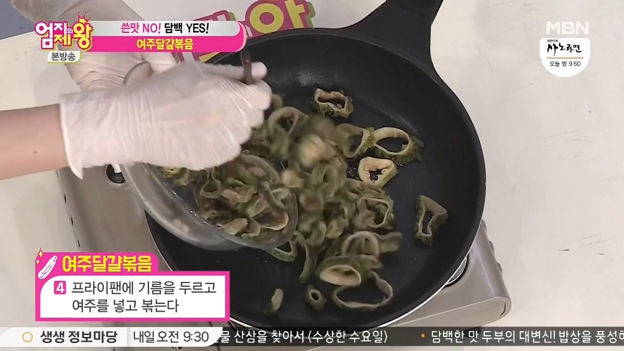 4. 프라이팬에 기름을 두르고 물기를 짠 여주를 넣고 볶는다.