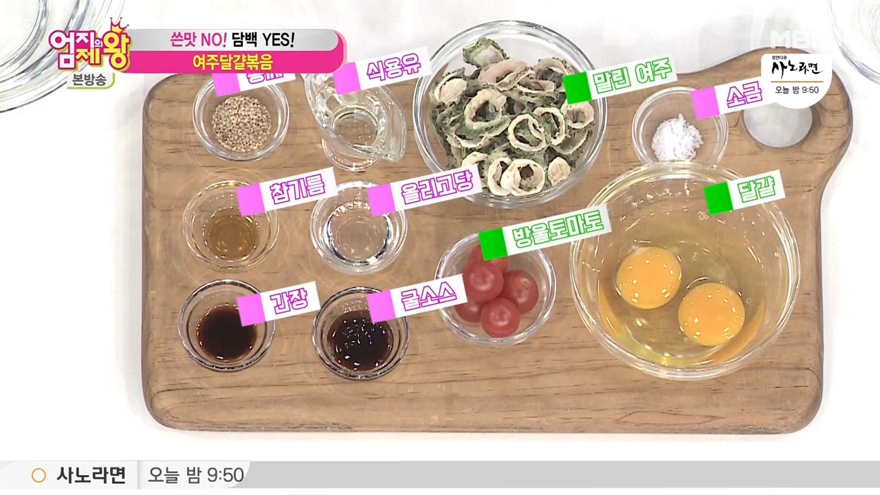 말린 여주, 소금, 달걀, 방울토마토, 굴소스, 올리고당, 식용유, 간장, 참기름, 통깨