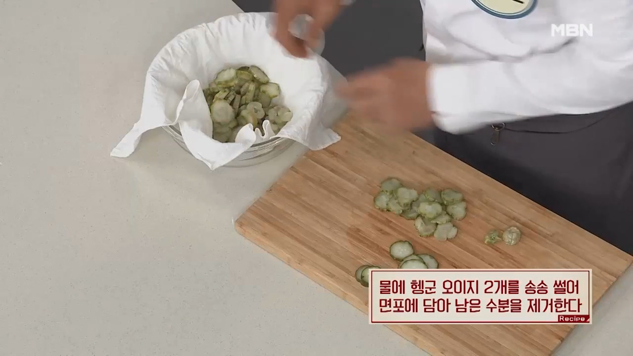 1. 물에 헹군 오이지 2개를 송송 썰어 면포에 담아 남은 수분을 제거합니다.