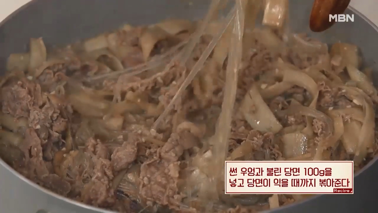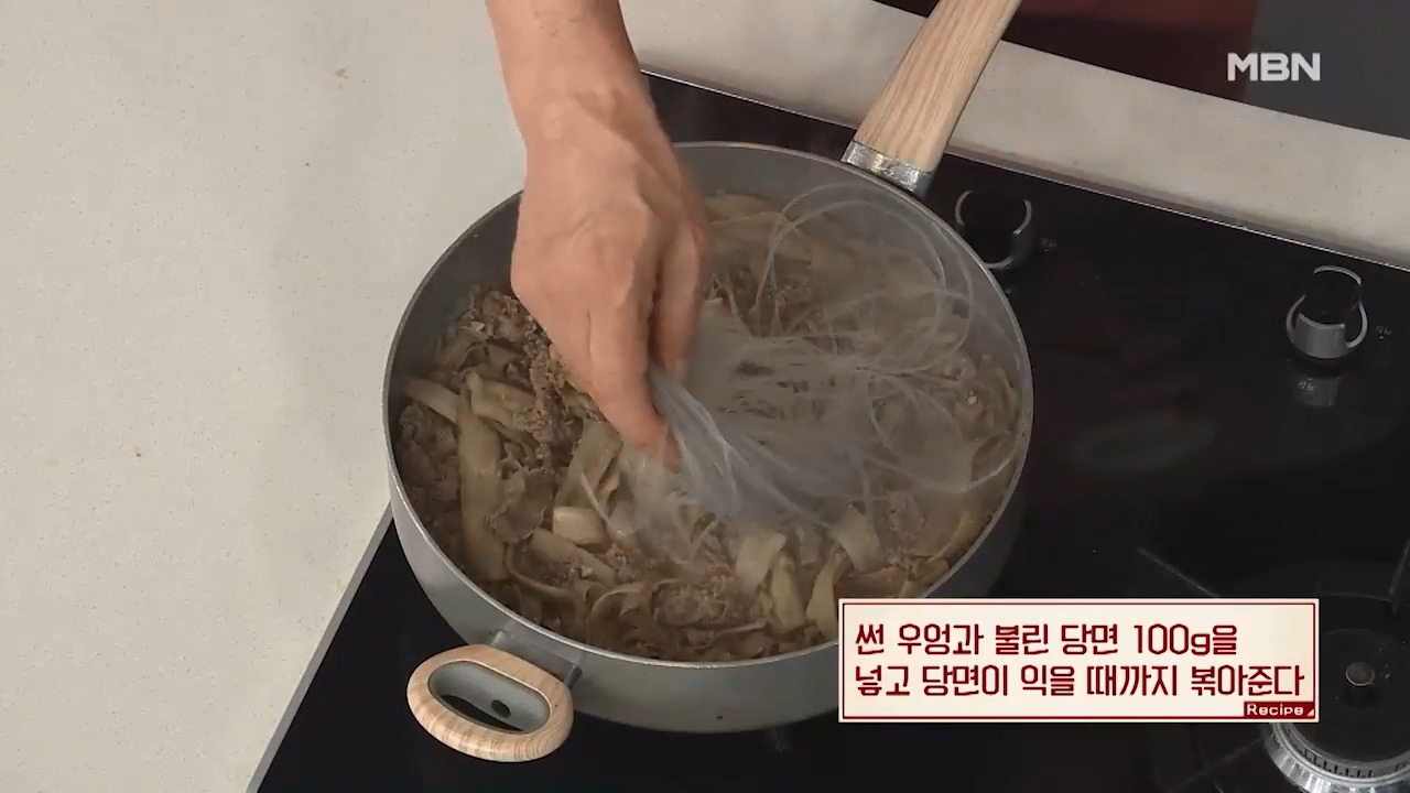 8. 썬 우엉과 불린 당면 100g을 넣고 당면이 익을때까지 볶아주면 됩니다.