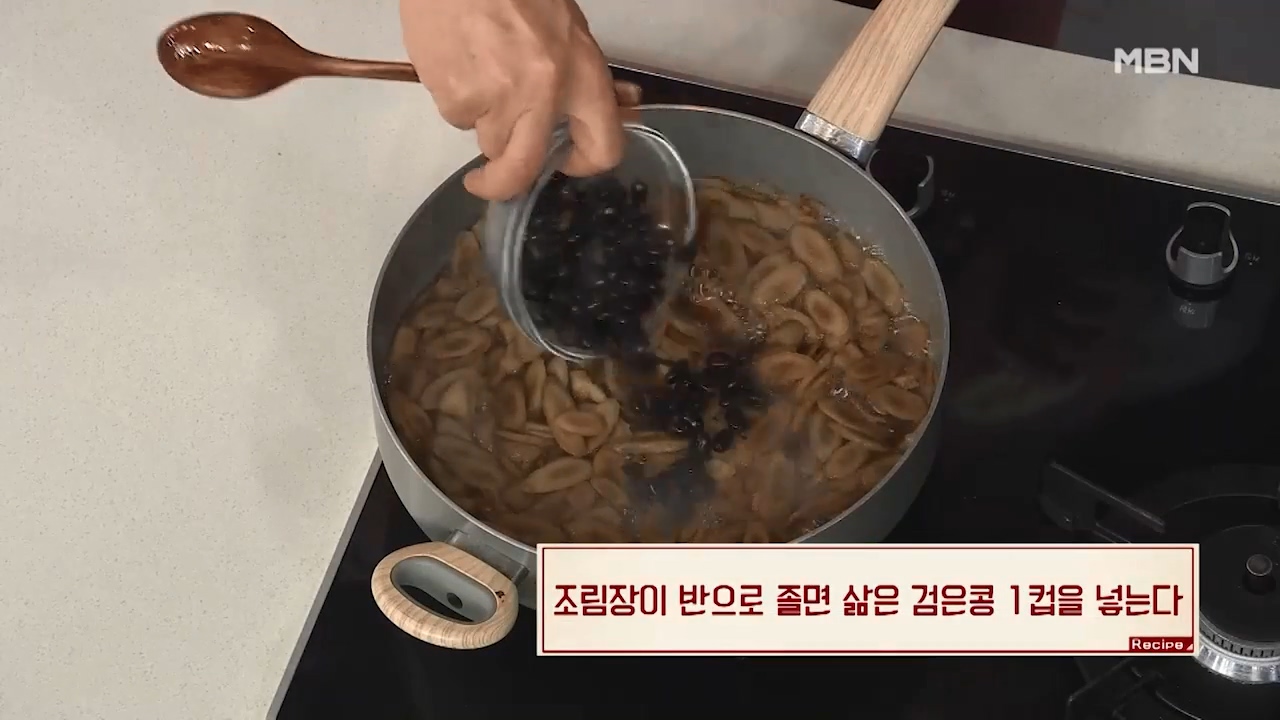 11. 조림장이 반으로 졸면 삶은 검은콩 1컵을 넣습니다.