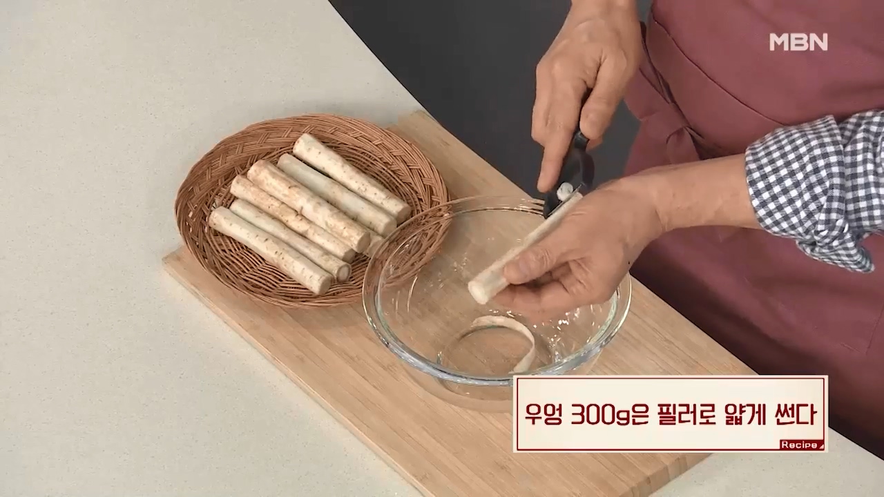 1. 우엉 300g은 필러로 얇게 썰어줍니다.