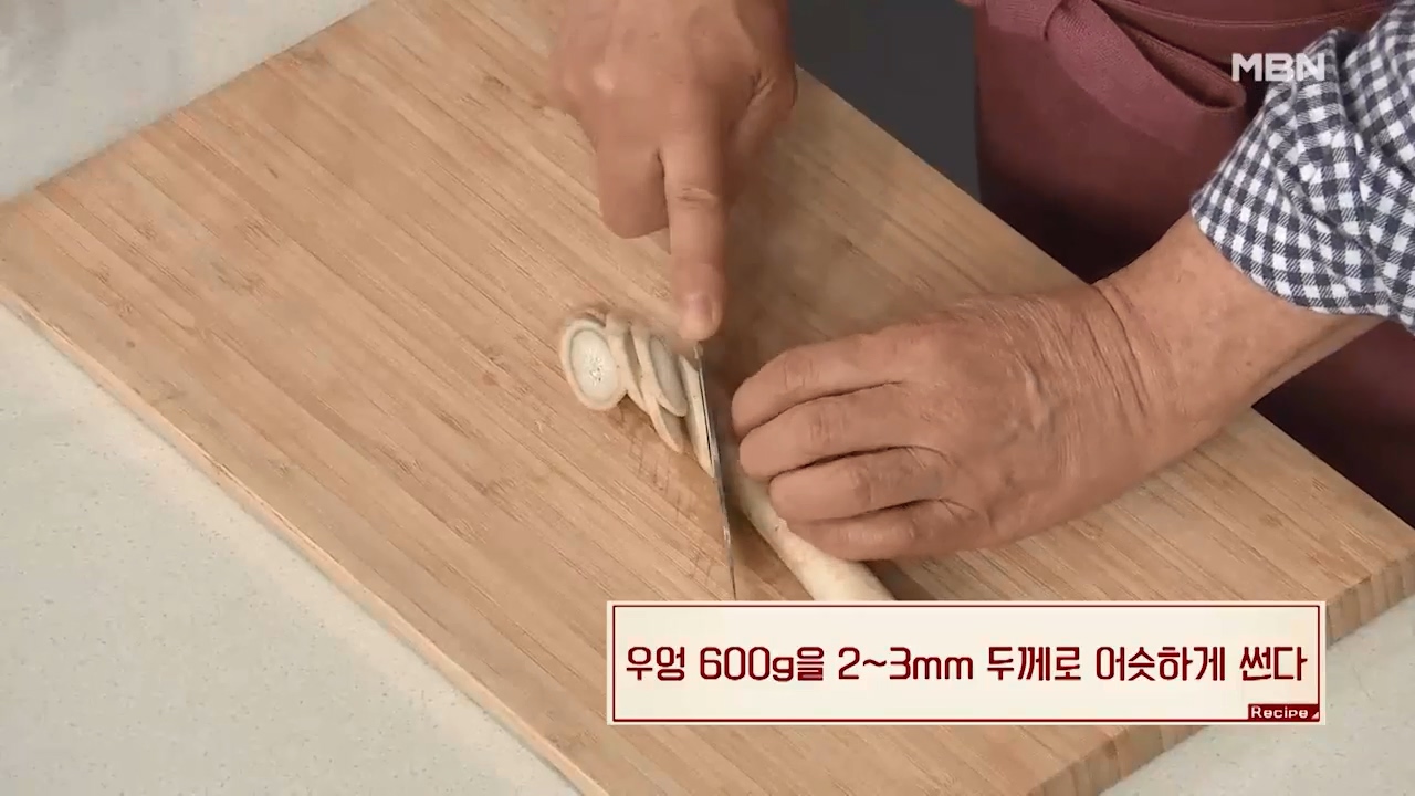 1. 우엉 600g을 2~3mm 두께로 어슷하게 썰어줍니다.
