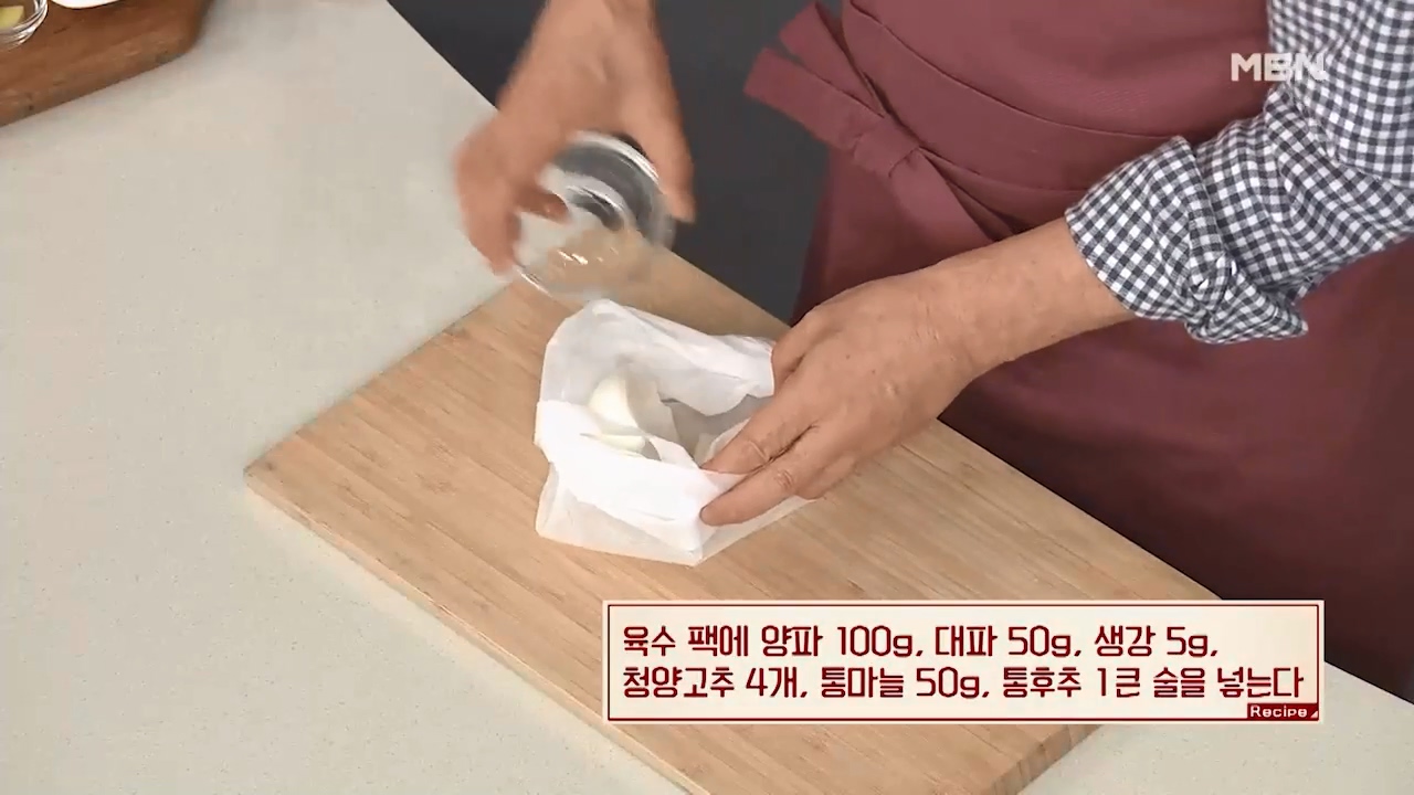 6. 육수 팩에 양파 100g, 대파 50g, 생강 5g, 청양고추 4개, 통마늘 50g, 통후추 1큰술을 넣습니다.
