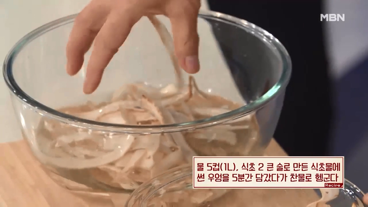 2. 물 5컵(1리터), 식초 2큰술로 만든 식초물에 썬 우엉을 5분간 담갔다가 찬물로 헹굽니다.
