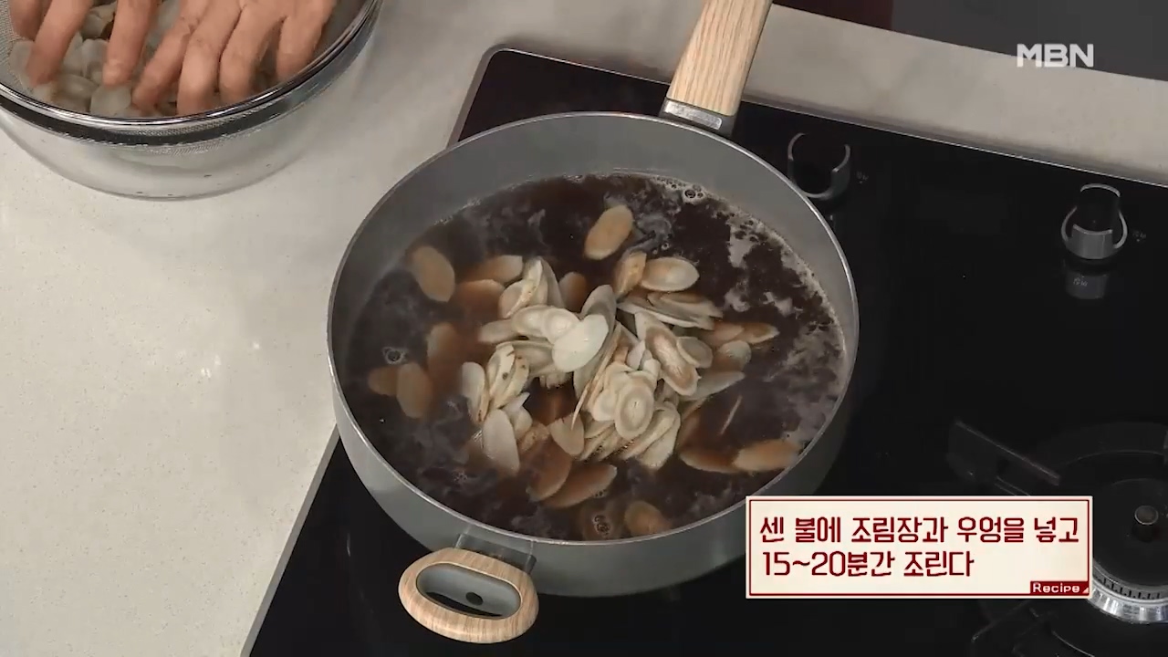 10. 센불에 조림장과 우엉을 넣고 15~20분간 조려줍니다.