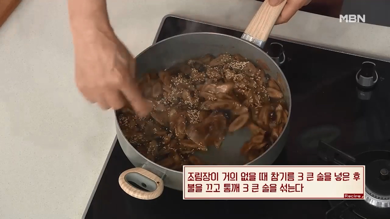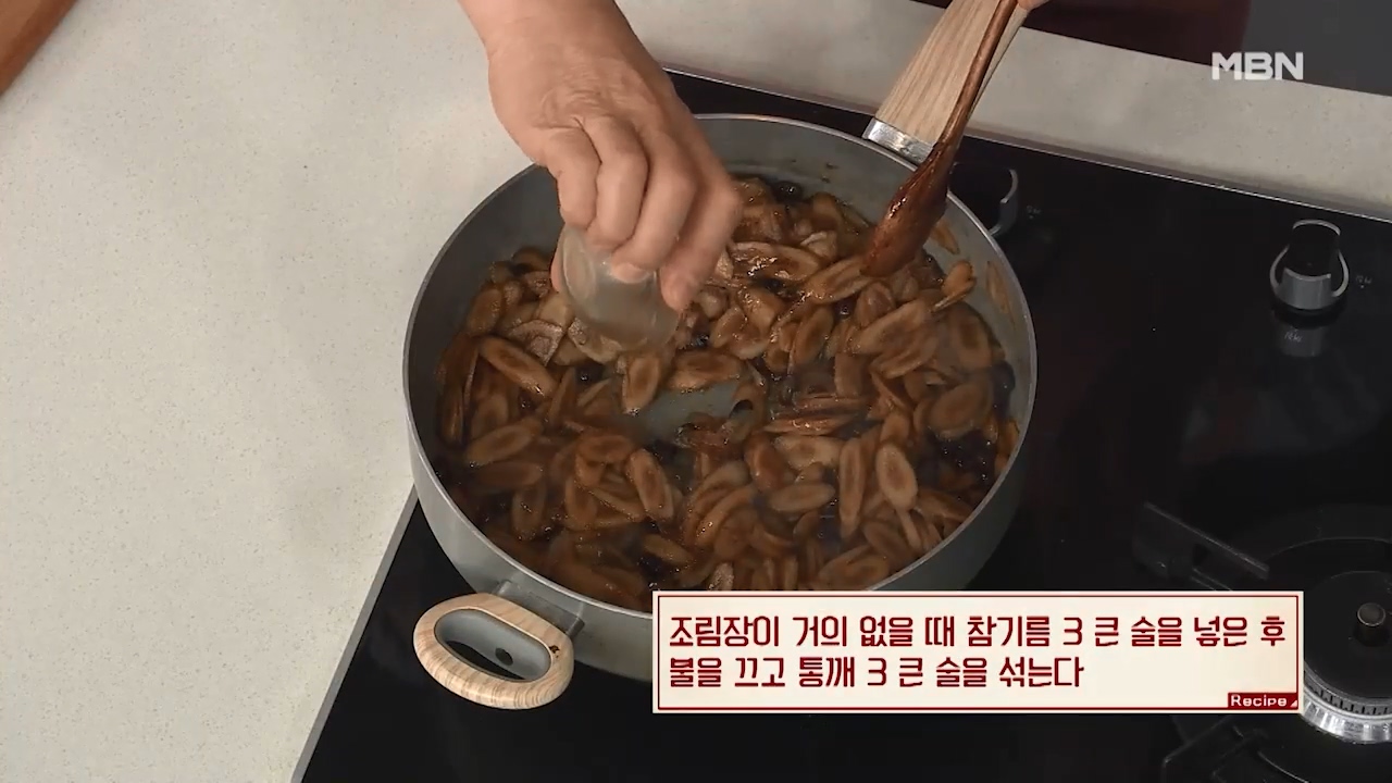 12. 조림장이 거의 없을때 참기름 3큰술을 넣은 후 불을 끄고 통깨 3큰술을 섞어주면 우엉조림이 완성됩니다.