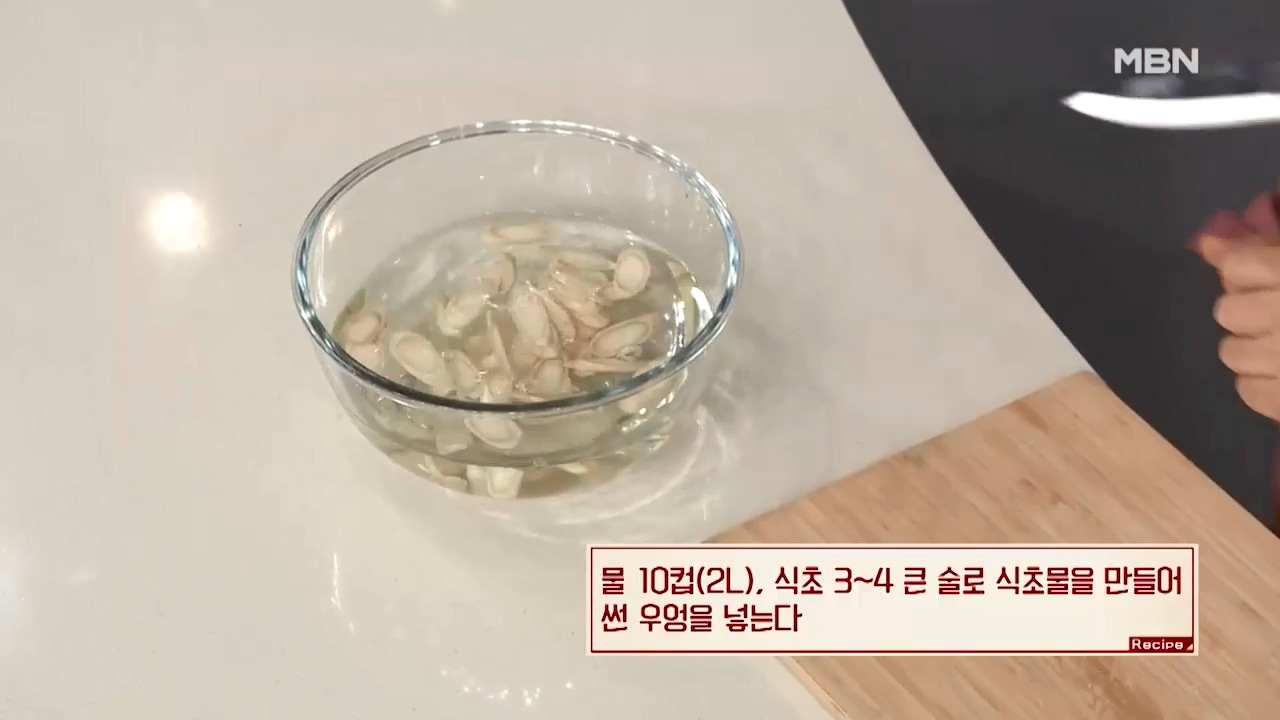 2. 물 10컵 2리터에 식초 3~4큰술을 넣어 식초물을 만들고 거기에 썬 우엉을 넣습니다.
