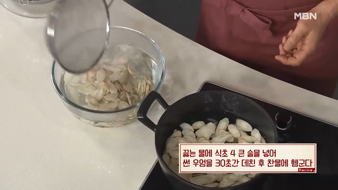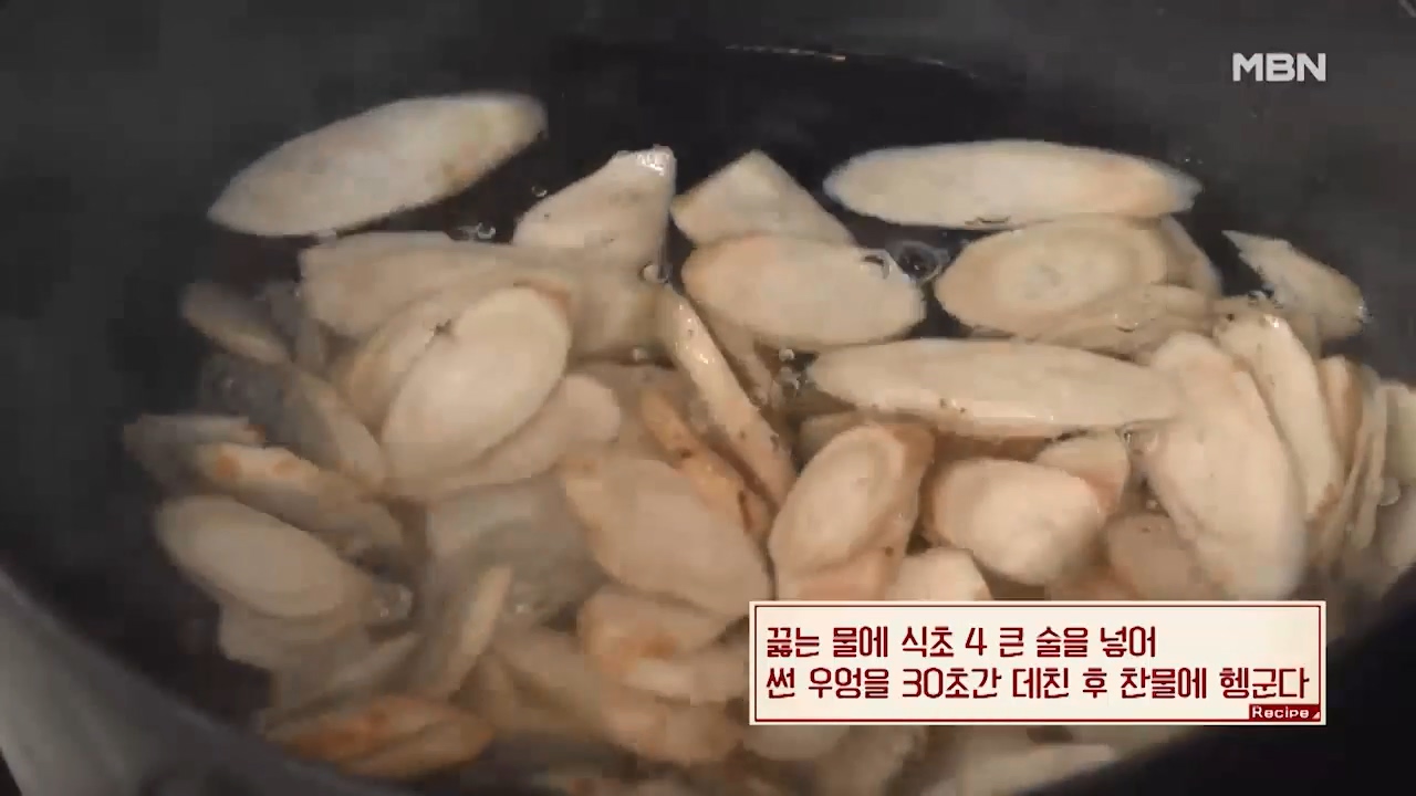 3. 끓는물에 식초 4큰술을 넣어 썬 우엉을 30초간 데친 후 찬물에 헹굽니다.