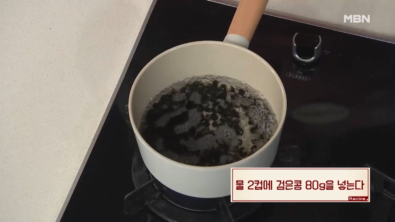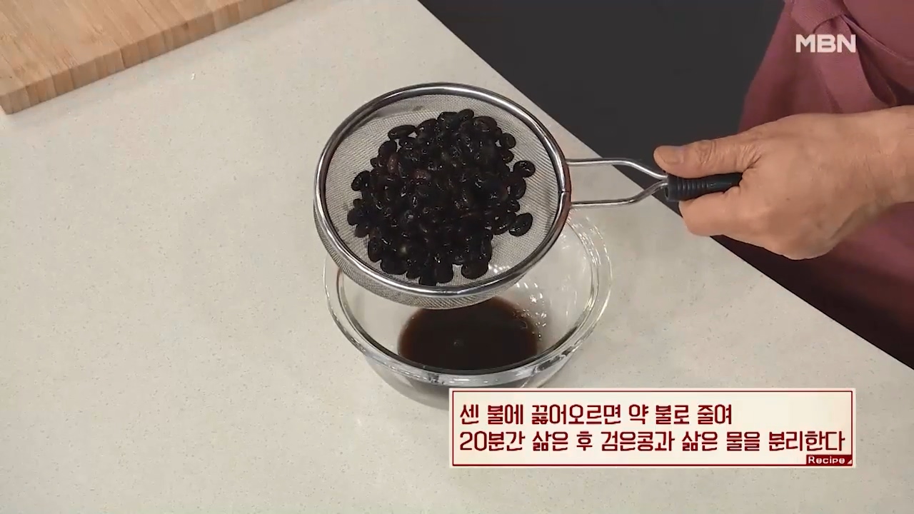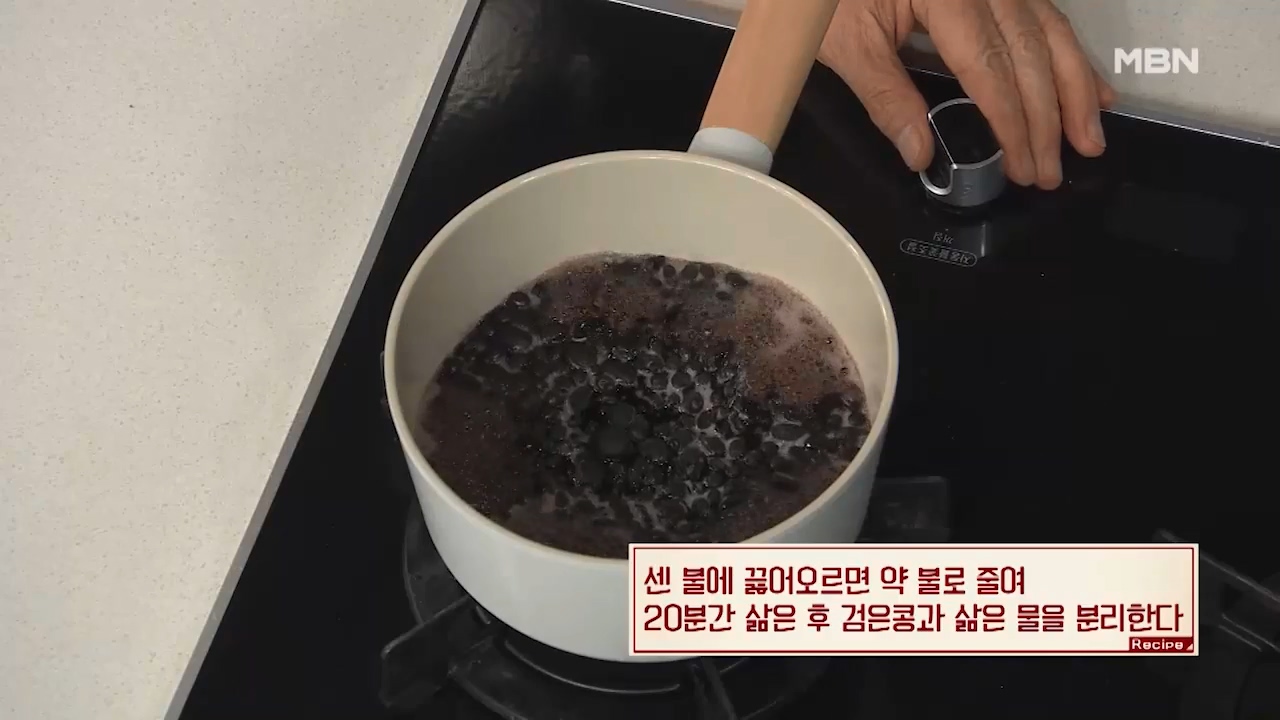 5. 센불에 끓어오르면 약불로 줄여 20분간 삶은 후 검은콩과 삶은 물을 분리합니다.