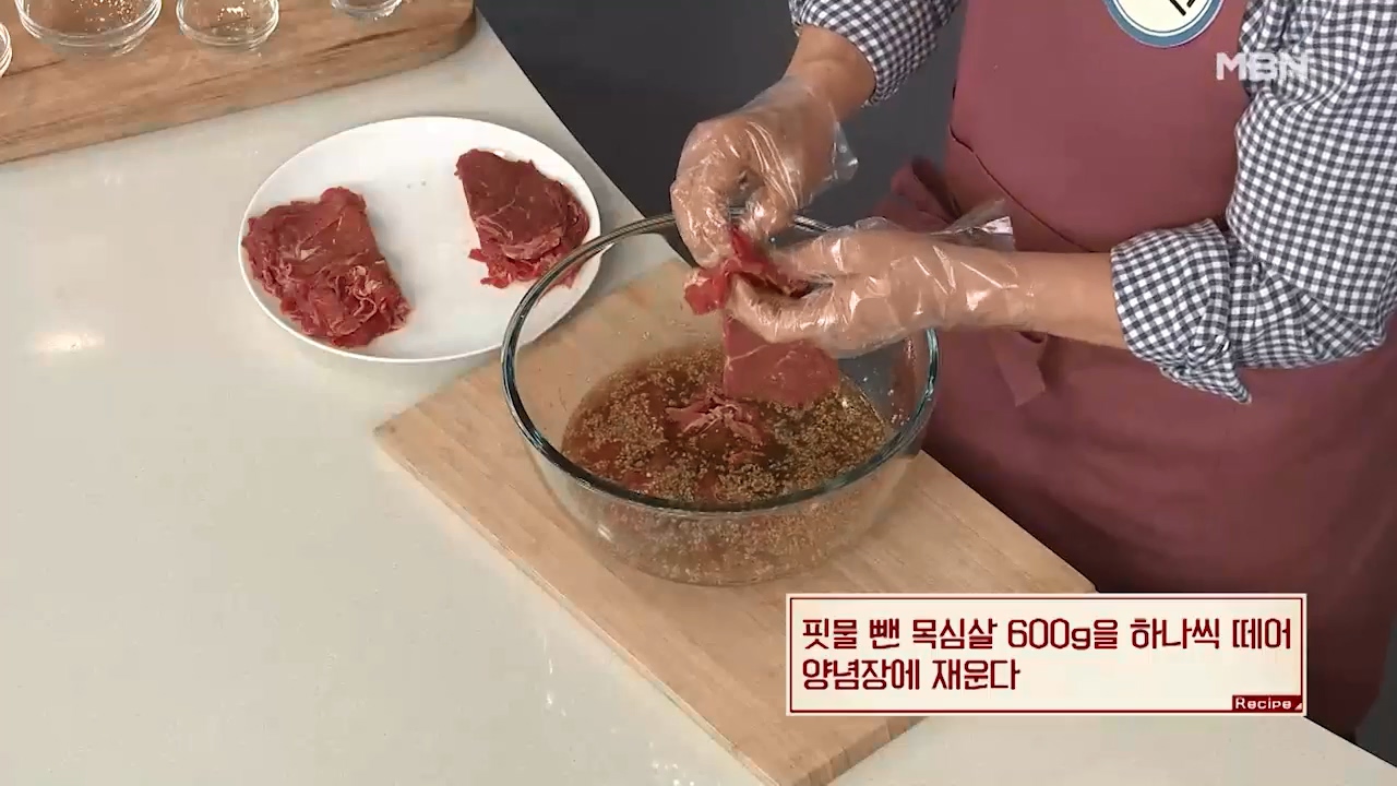 6. 핏물 뺀 목심살 600g을 하나씩 떼어 양념장에 재웁니다.