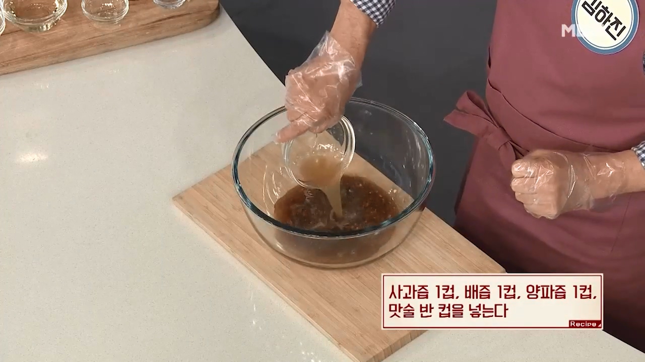 4. 사과즙 1컵, 배즙 1컵, 양파즙 1컵, 맛술 반컵을 넣습니다.