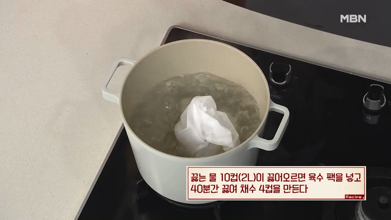 7. 끓는 물 10컵(2리터)이 끓어오르면 육수 팩을 넣고 40분간 끓여 채수 4컵을 만들어 줍니다.
