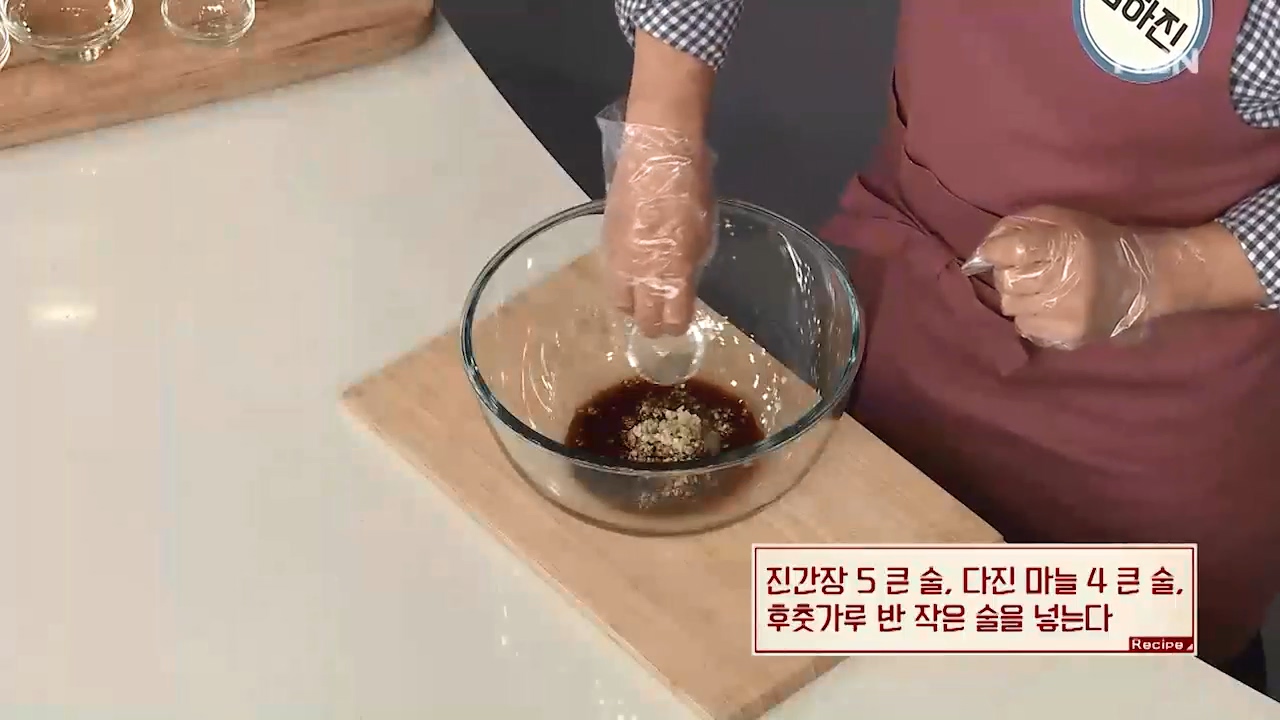 3. 진간장 5큰술, 다진 마늘 4큰술, 후춧가루 반 작은 술을 넣습니다.