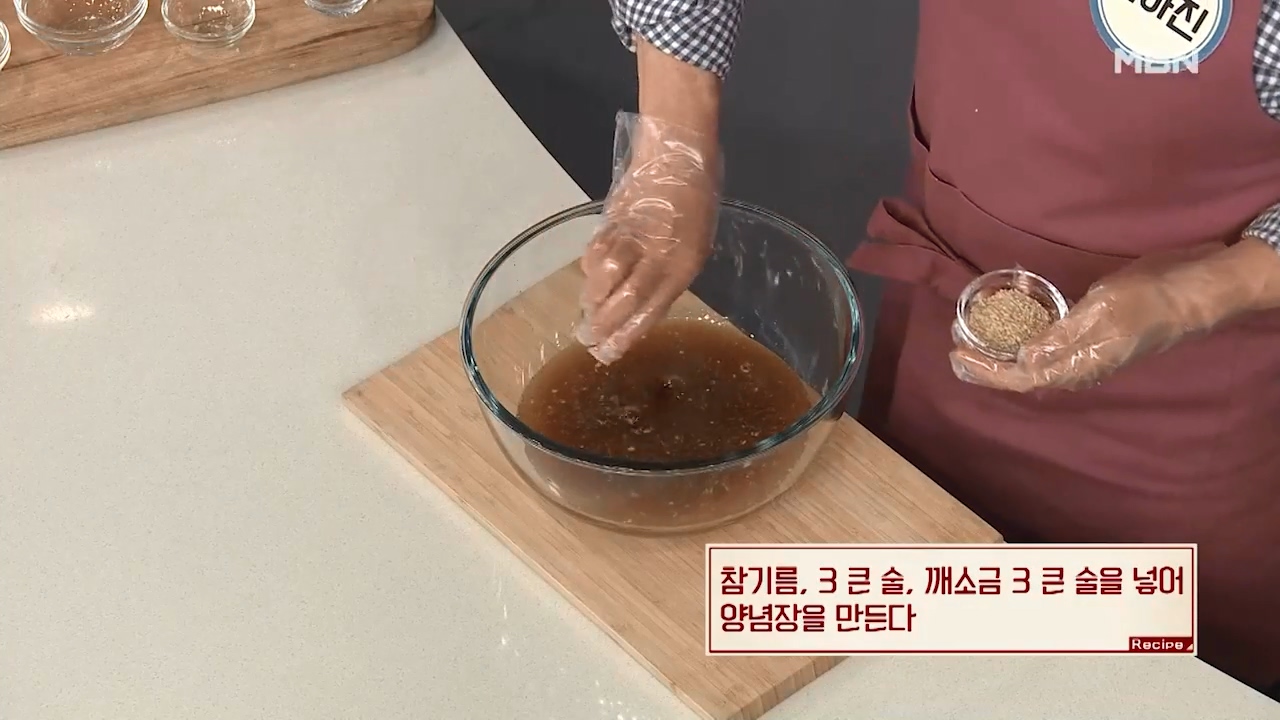 5. 참기름 3큰술, 깨소금 3큰술을 넣어 우엉불고기 양념장을 만들어줍니다.