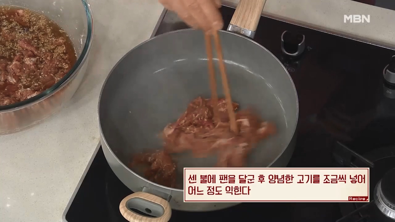 7. 센불에 팬을 단굴 후 양념한 고기를 조금씩 넣어 어느정도 익혀줍니다.