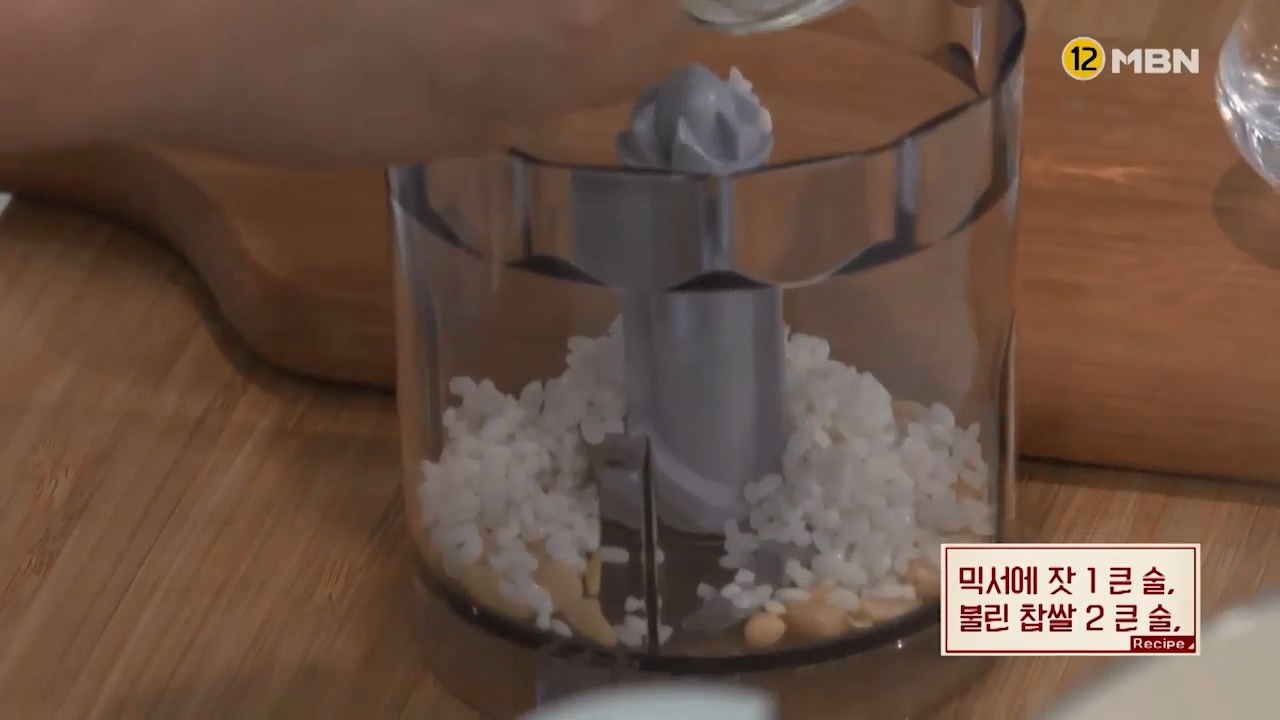 12. 믹서기에 잣 1큰술, 불린 찹쌀 2큰술, 물을 약간 넣고 곱게 갈아줍니다.