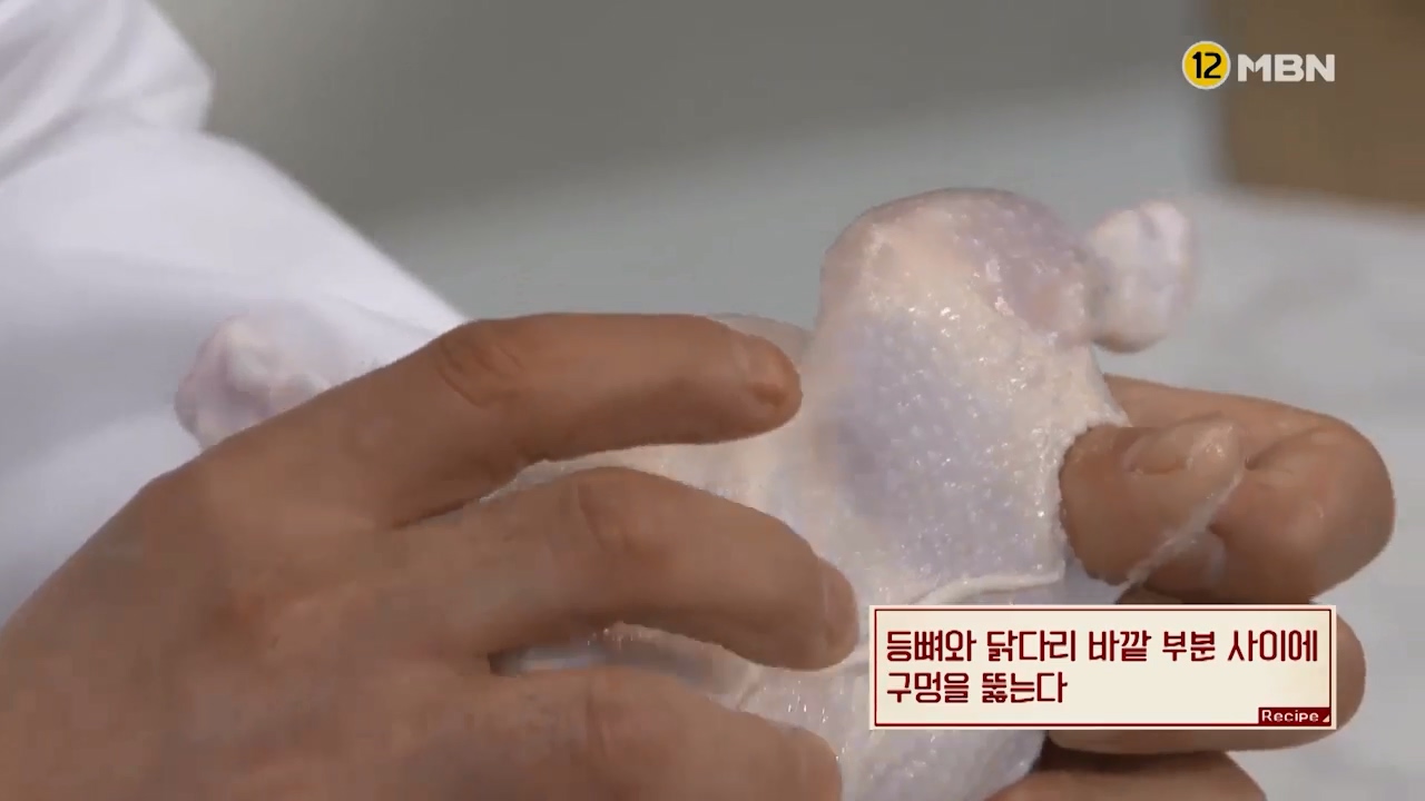 4. 닭 등뼈와 닭다리 바깥 부분 사이에 구멍을 뚫어줍니다.