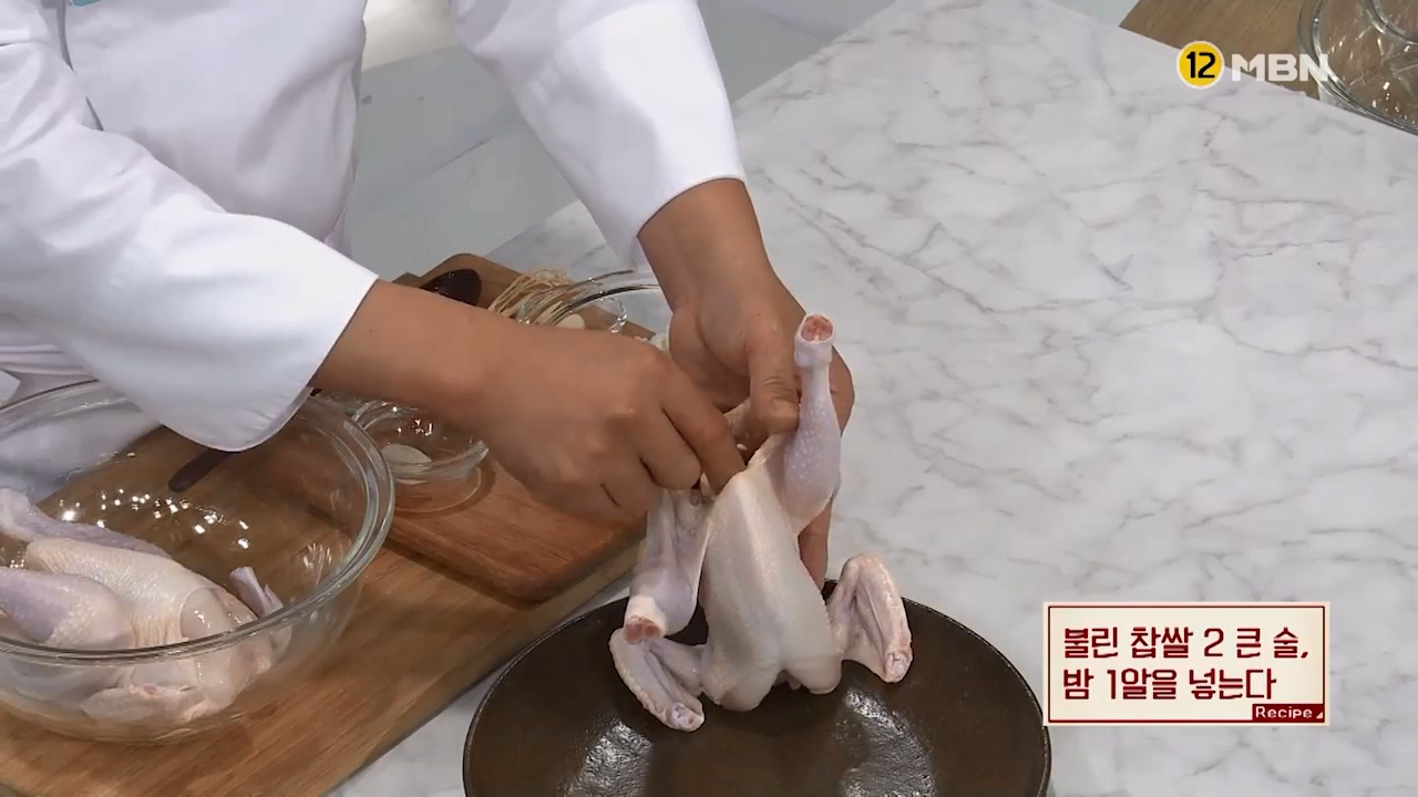 5. 닭 속에 마늘 2알, 대추 1알, 인삼 1뿌리, 불린 멥쌀 1큰술, 불린 찹쌀 2큰술, 밤 1알을 넣어줍니다.