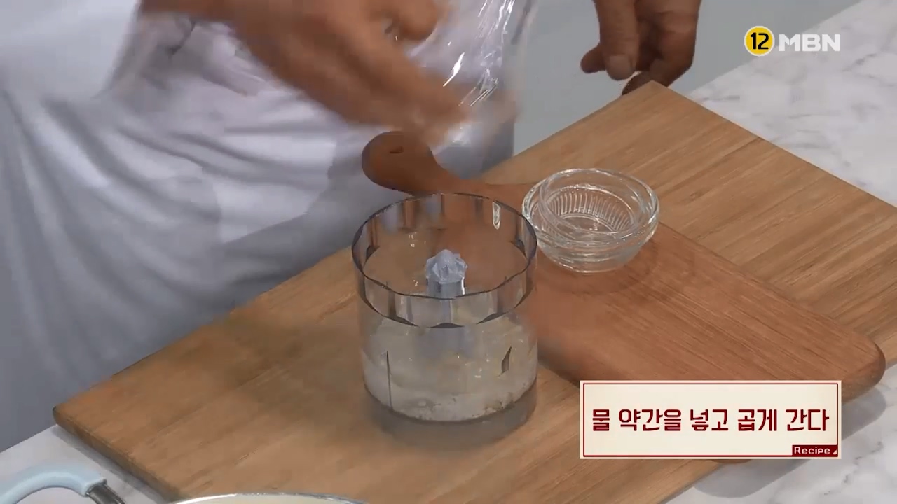 13. 곱게 간 찹쌀과 잣을 국물에 넣습니다.