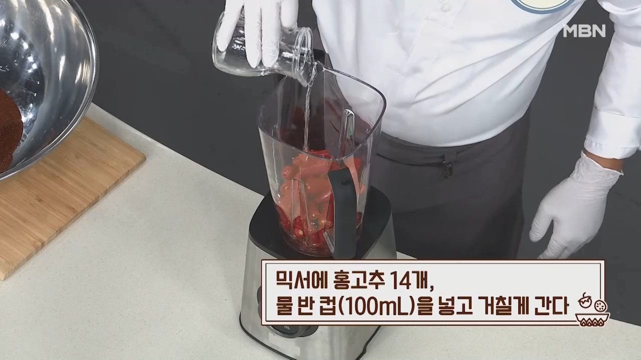 9. 믹서에 홍고추 14개, 물 반컵(100ml)을 넣고 거칠게 갈아줍니다.