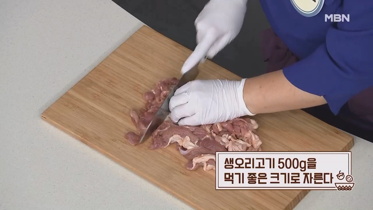 4. 생오리고기 500g을 먹기 좋은 크기로 자릅니다.