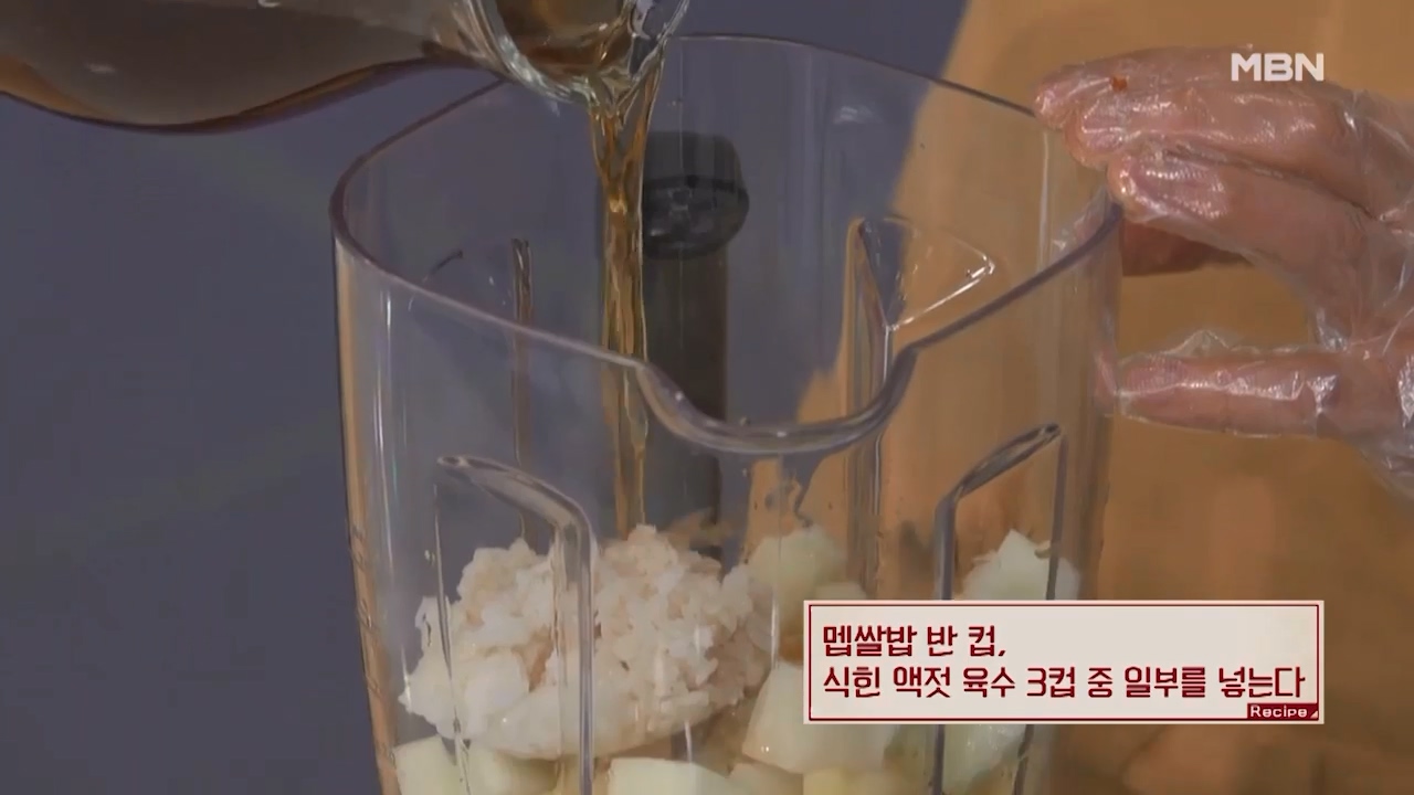 14. 멥쌀밥 반컵, 식힌 액젓 육수 3컵 중 일부를 넣어줍니다.