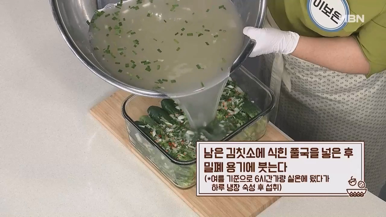 24. 남은 김칫소에 식힌 풀국을 넣은 후 밀폐용기에 붓고 여름 기준으로 6시간 가량 실온에 보관했다가 하루 냉장 숙성후 섭취하면 맛있는 백오이소박이물김치를 맛볼 수 있습니다.