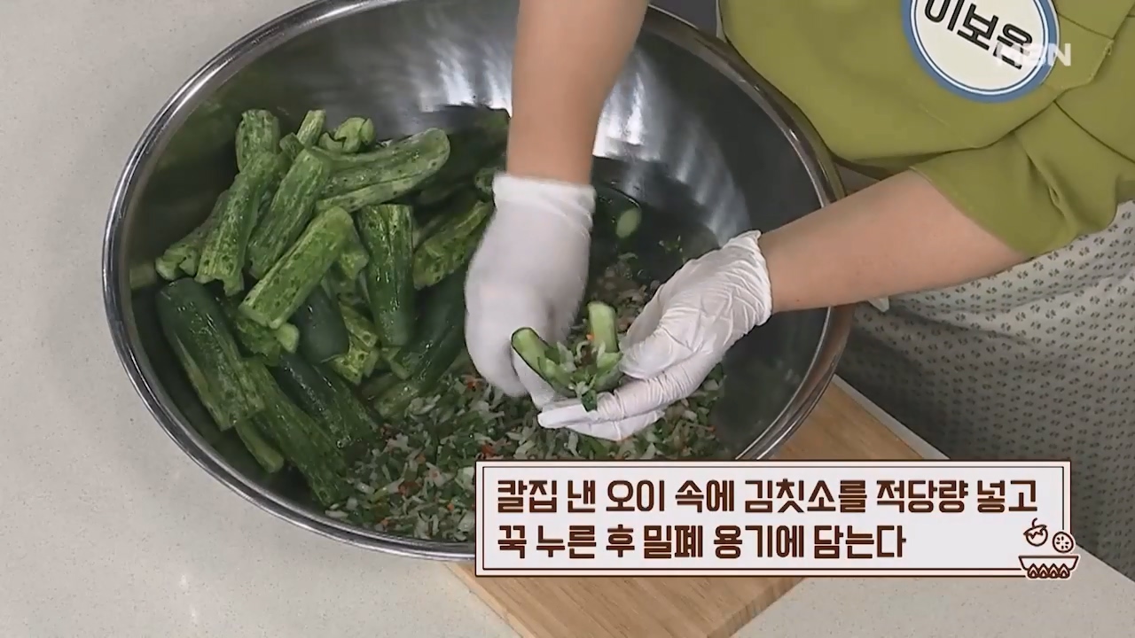 23. 칼집 낸 오이 속에 김칫소를 적당량 넣고 꾹 누른 후 밀폐용기에 담습니다.